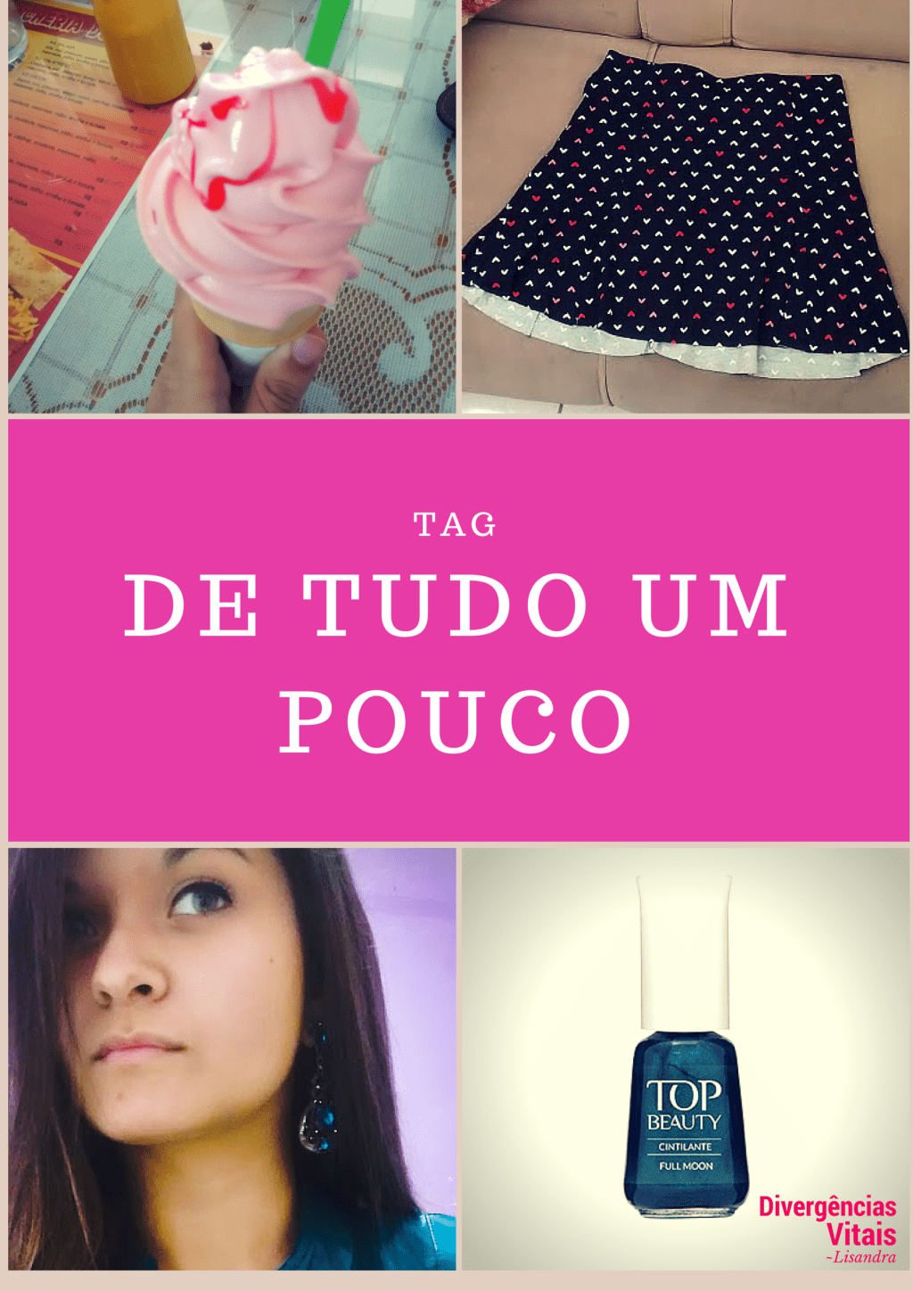 O tio Diver faz sucesso nas indicações de Tags, e, para não perder o costume, vamos a mais uma. A de hoje se chama “De Tudo Um Pouco”, criada pela Eduarda, do Atrás da Penteadeira, e fomos indicadas pela querida Pamela, do Pamela Voos. As regras são: