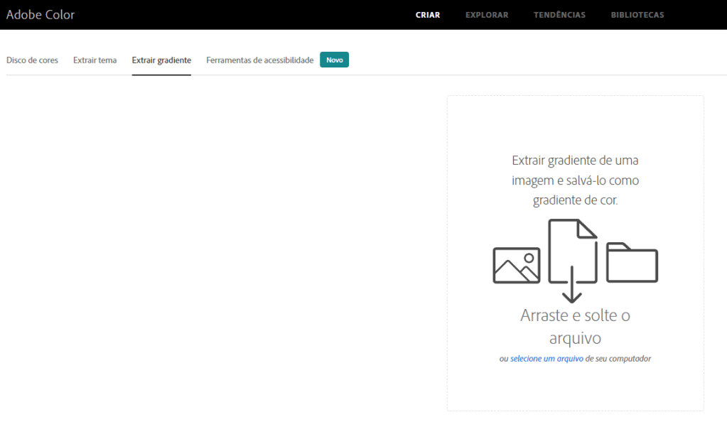 Depois de definir a imagem, você abre o site do Adobe Color, clica em “Extrair gradiente” e faz o upload da foto que você gostar.