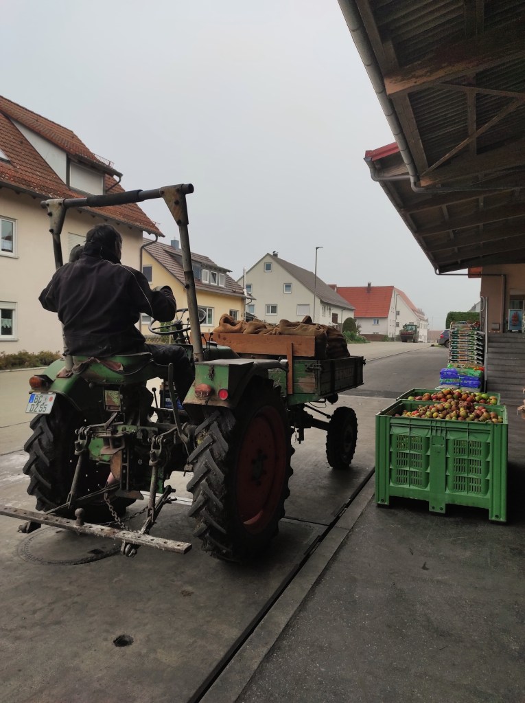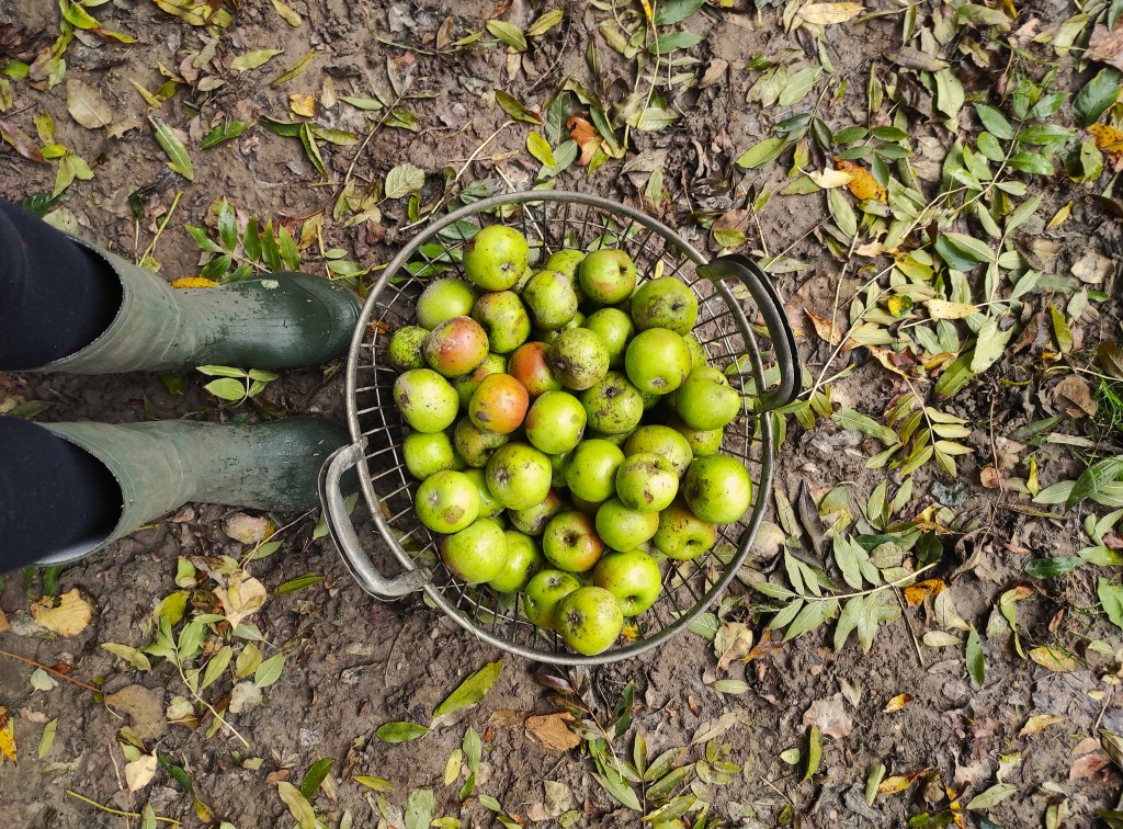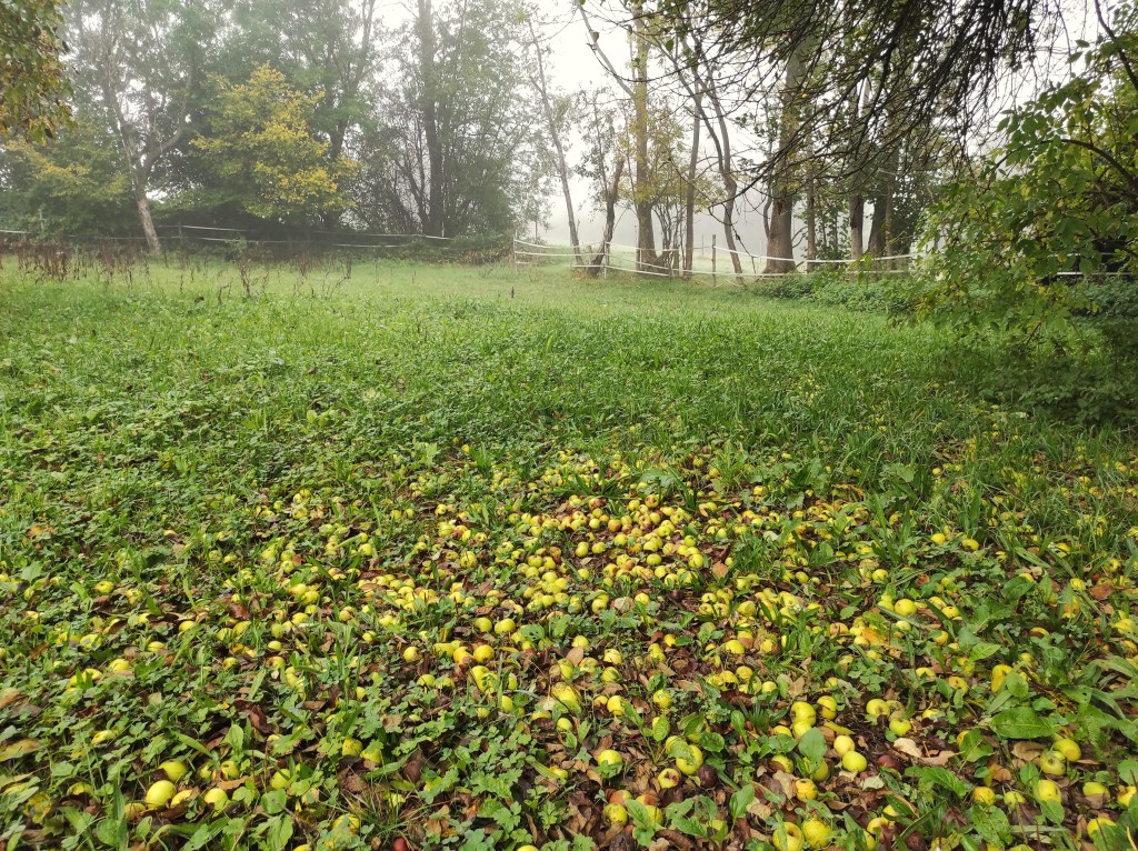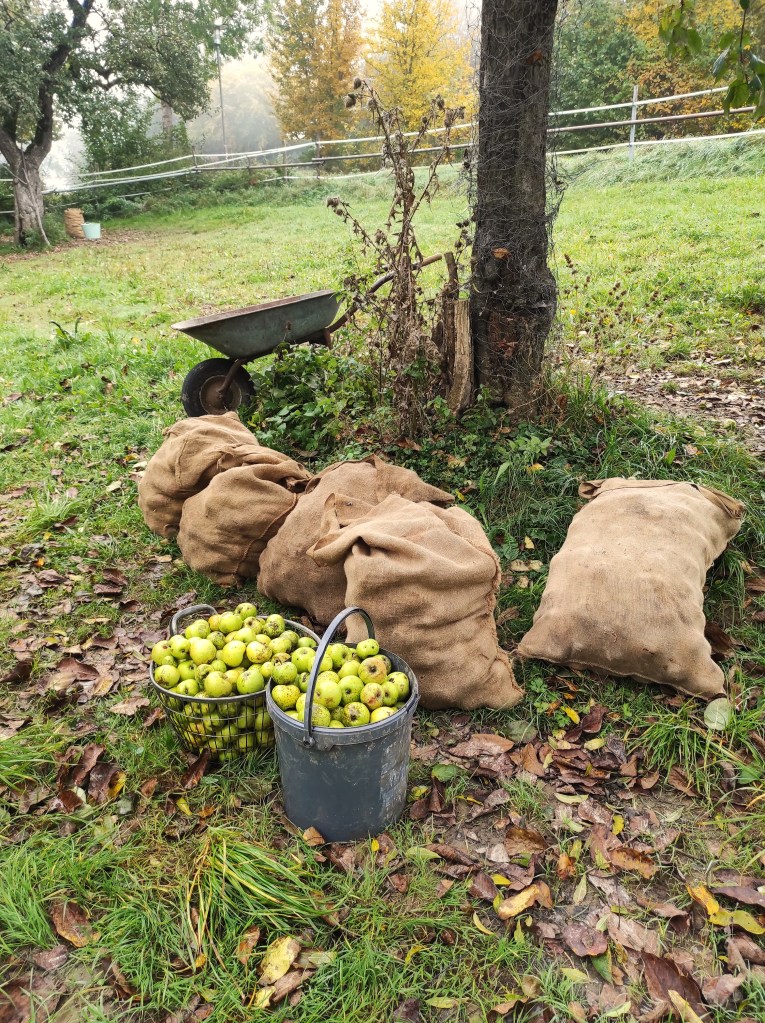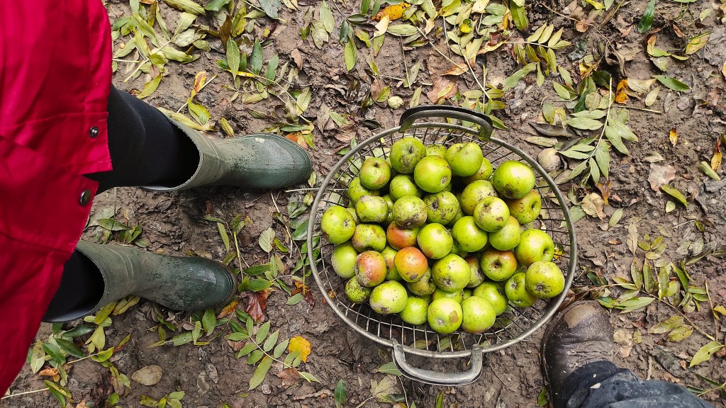 Em dias frios e úmidos, as maçãs que caem da árvore se mantém suculentas e apodrecem mais devagar. Mesmo elas estando no chão, o processo de beneficiamento delas é bem tranquilo e acaba nem sendo motivo de nojo. A nossa colheita de maçãs era em partes para encaminhar para uma empresa (para fazer suco) e em outra parte, para receitas e delícias que queríamos fazer em casa.
