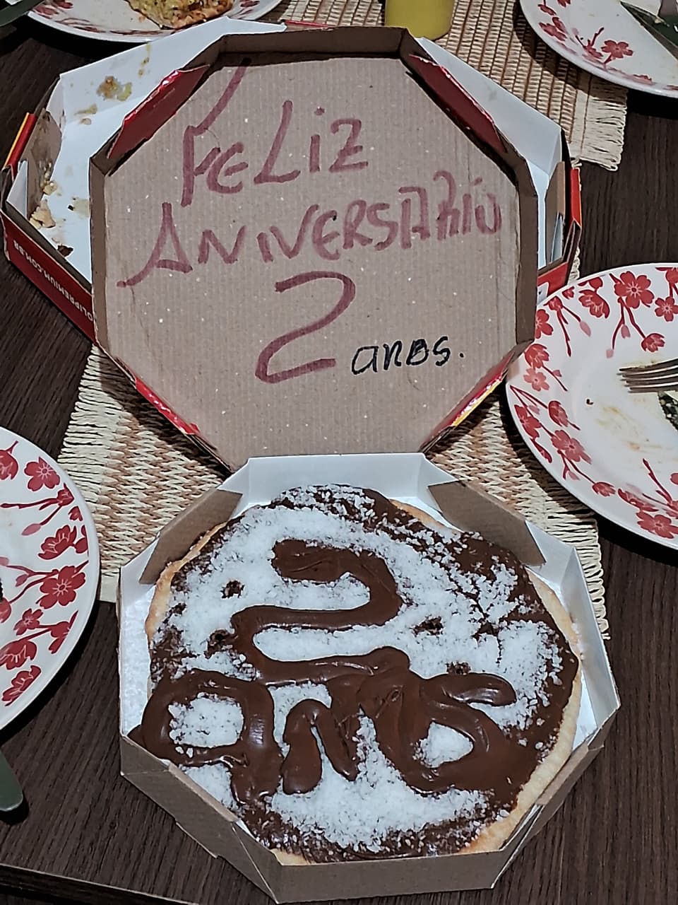 Será que o pessoal da pizzaria desconfiou que tudo que escreveram na pizza e na caixa eram pra duas cachorrinhas? 😂